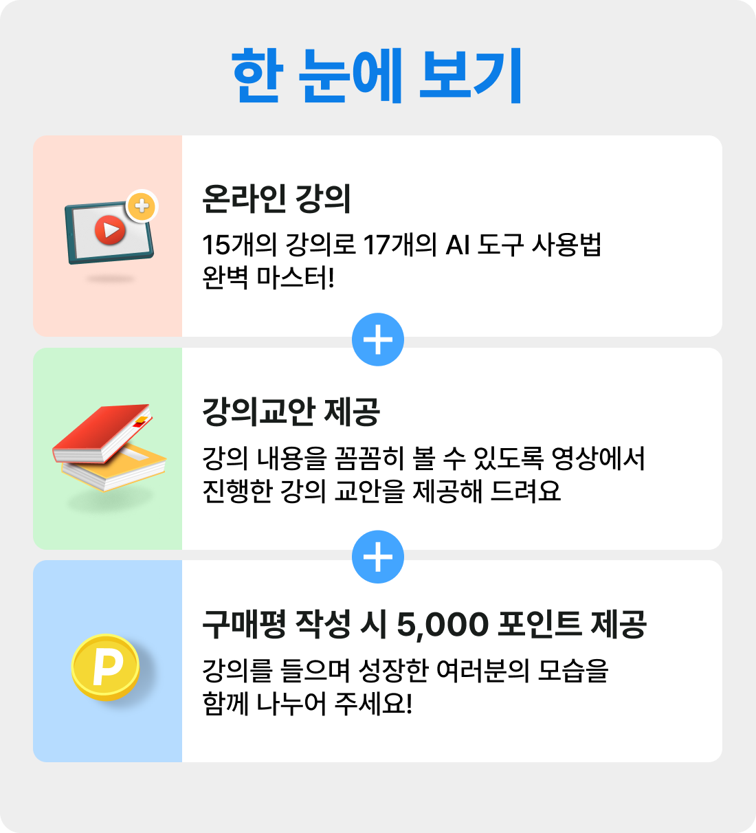 | 1강 | 오프닝 | - | 1그램의 경험이 1톤의 이론보다 낫다! 생성형 AI 시대의 핵심 ‘점-선-면’을 연결하라 |