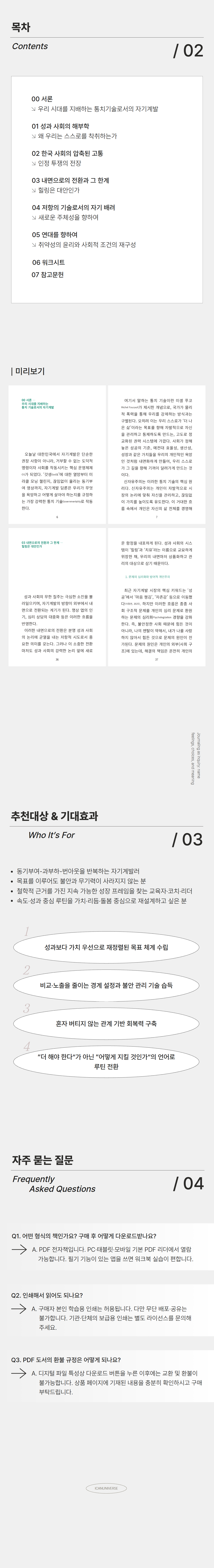 더 빨리, 더 많이, 더 잘해야 한다는 업그레이드의 강박이 왜 우리를 지치게 하는지 철학과 일상의 언어로 해부합니다. 푸코의 자기 배려를 토대로 목표–가치–리듬의 순서를 다시 세우고, 비교의 회로를 끊는 경계 설정, 불안을 다루는 기록·사유 루틴, 관계 속에서 회복력을 키우는 실천까지—약 100p의 내용 속에서 보이는 성과보다 지속 가능한 나의 삶을 설계하는 방법을 제시합니다. 또한 실천 워크시트를 수록하여 나의 삶에 즉시 적용 가능한 도구를 제공합니다.
