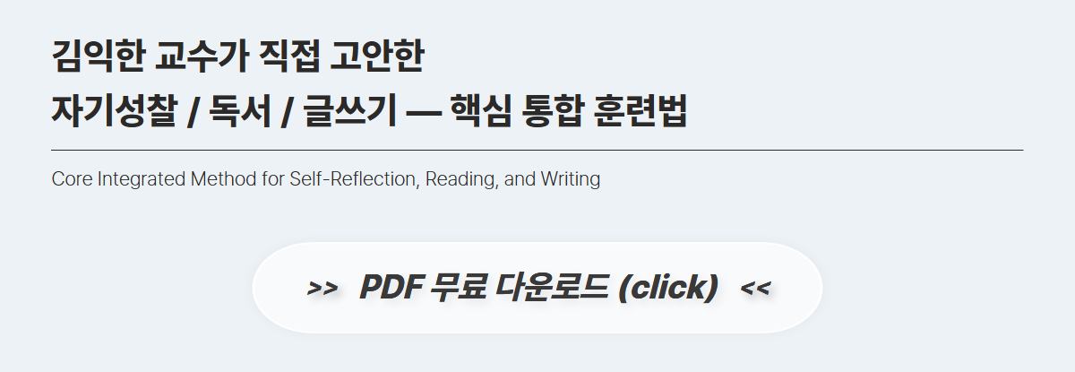 <김익한 교수의 자기성찰+독서+글쓰기 핵심 훈련법> pdf를 무료로 받아 보실 수 있습니다.